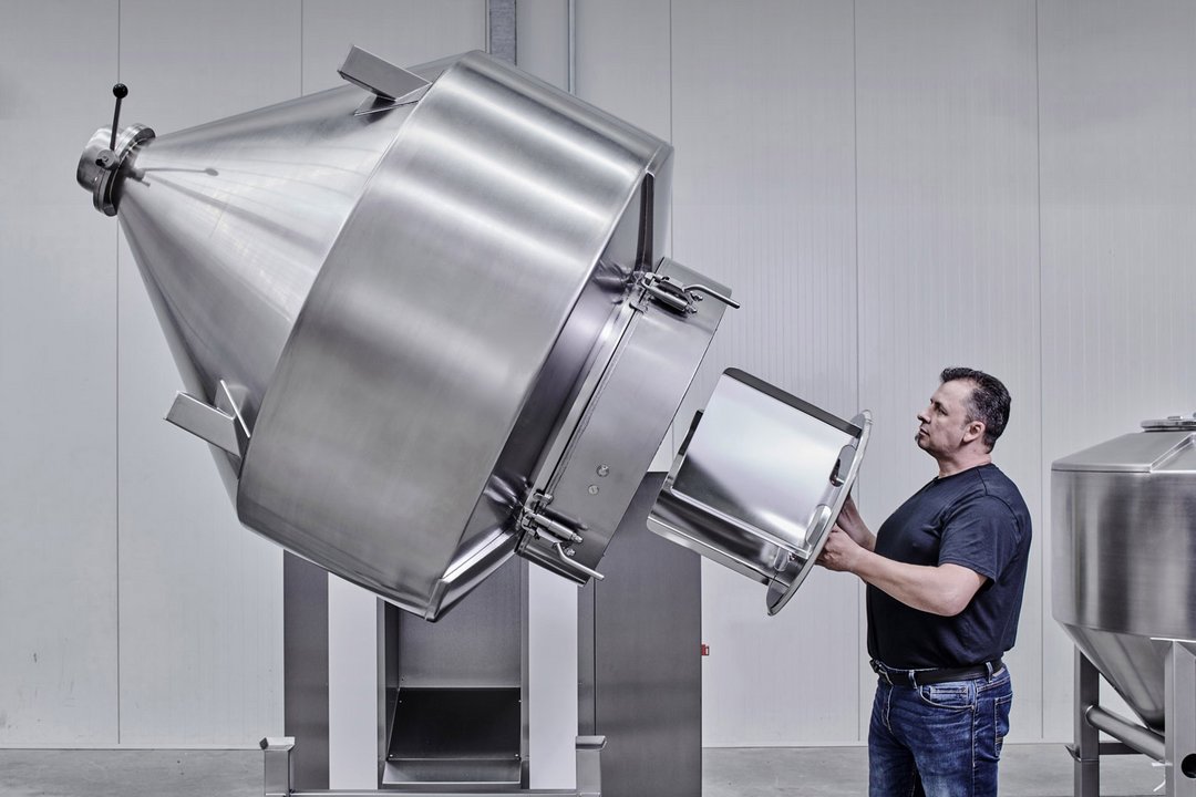 An unserem Produktionsstandort in Sassenberg dreht sich alles um Handling-Lösungen für die Tablettenproduktion. D. h. hier bauen wir verkettete Systeme, Mischer, Siebmaschinen, Hubsysteme und Behälter für den Einsatz in der Pharmaindustrie.
